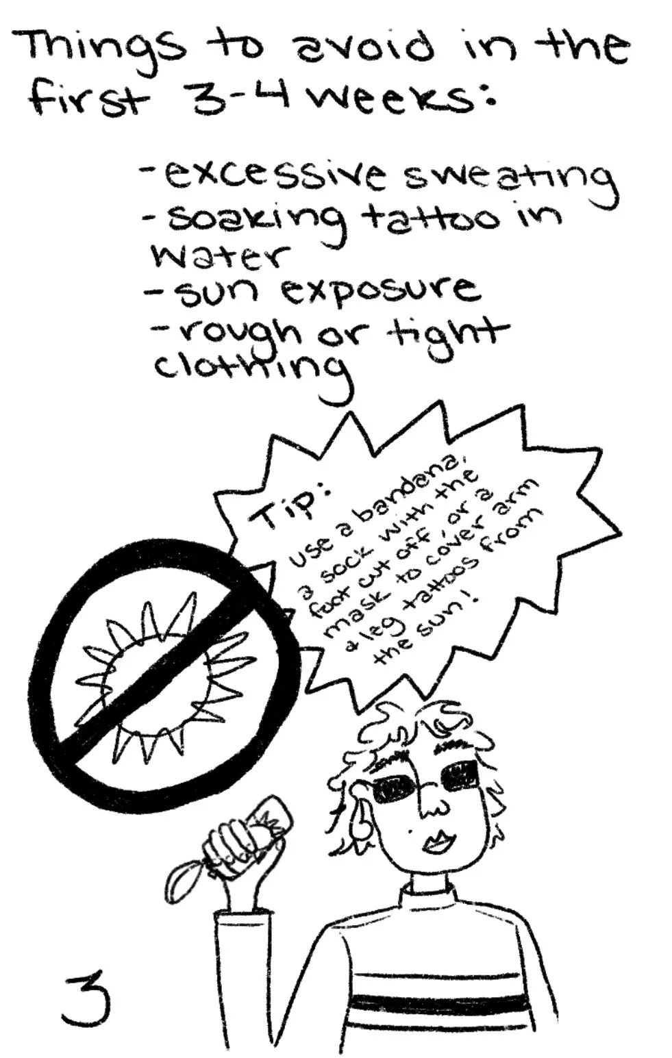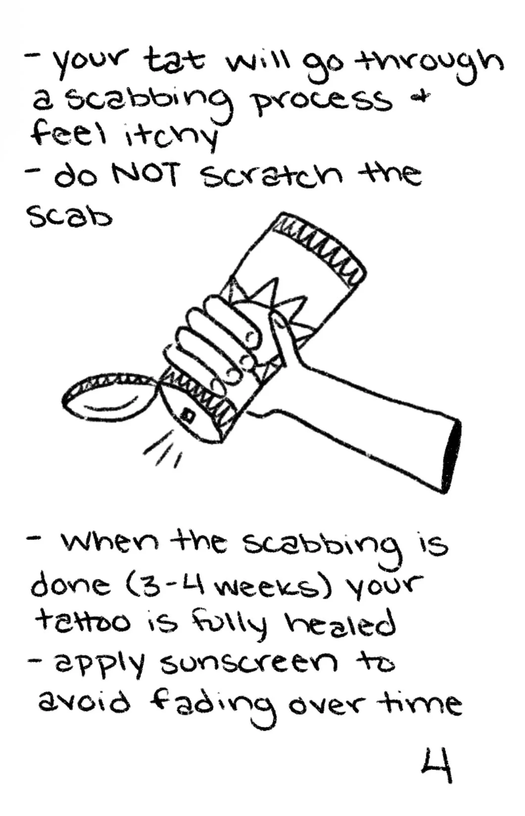 Avoid exposing your tattoo to the sun until fully healed (after the scabbing process/ usually 2-3 weeks for handpoked tattoos). Leg and arm tattoos can be covered with *clean* bandanas, masks, pieces of cloth, bandages, etc. Once fully healed, use sunscreen anytime your tattoo is in the sun! UV is the main factor in fading and blurring tattoos, so use sunscreen as much as possible.