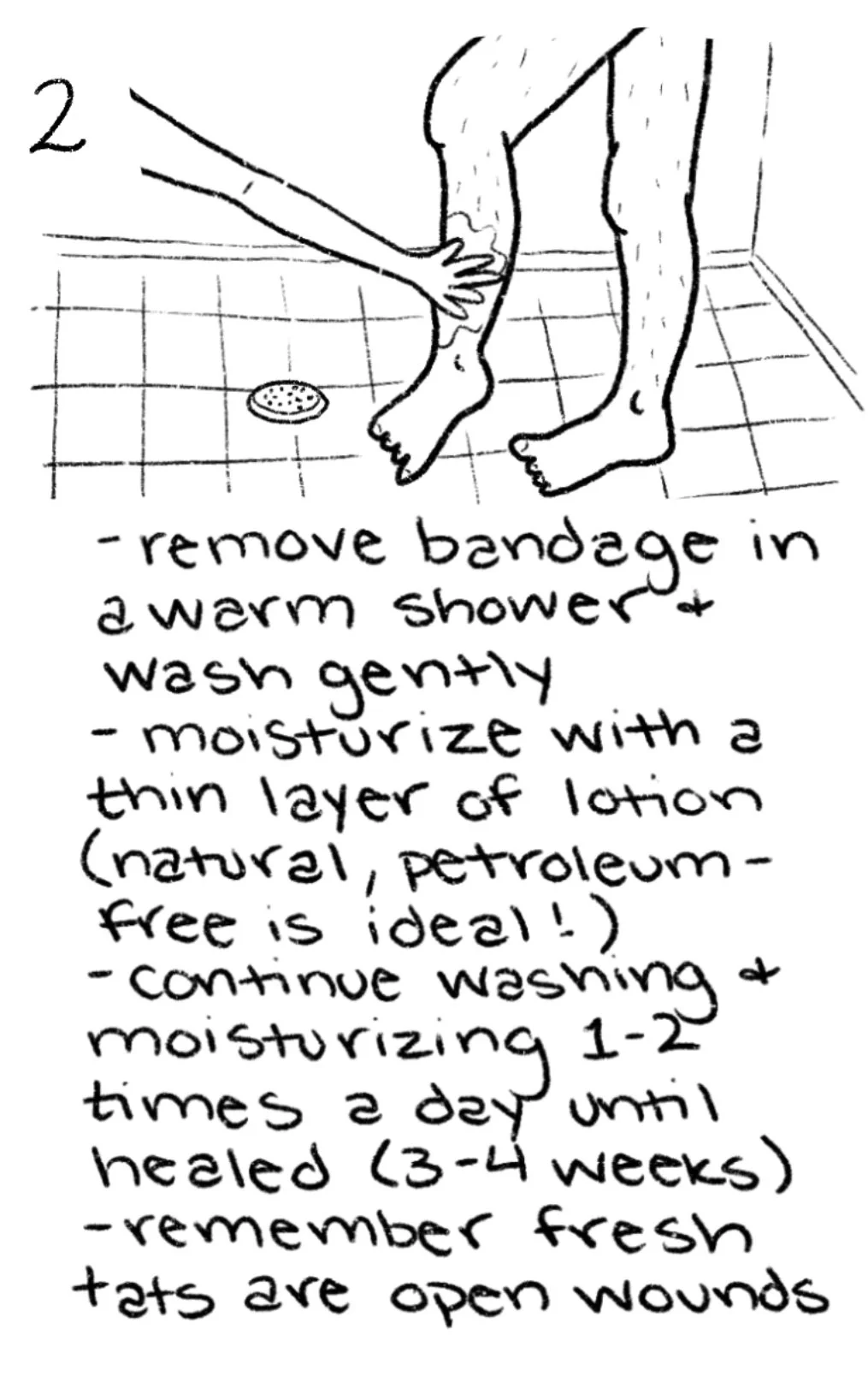 Continue daily washing and moisturizing until the tattoo if fully healed (2-3 weeks).