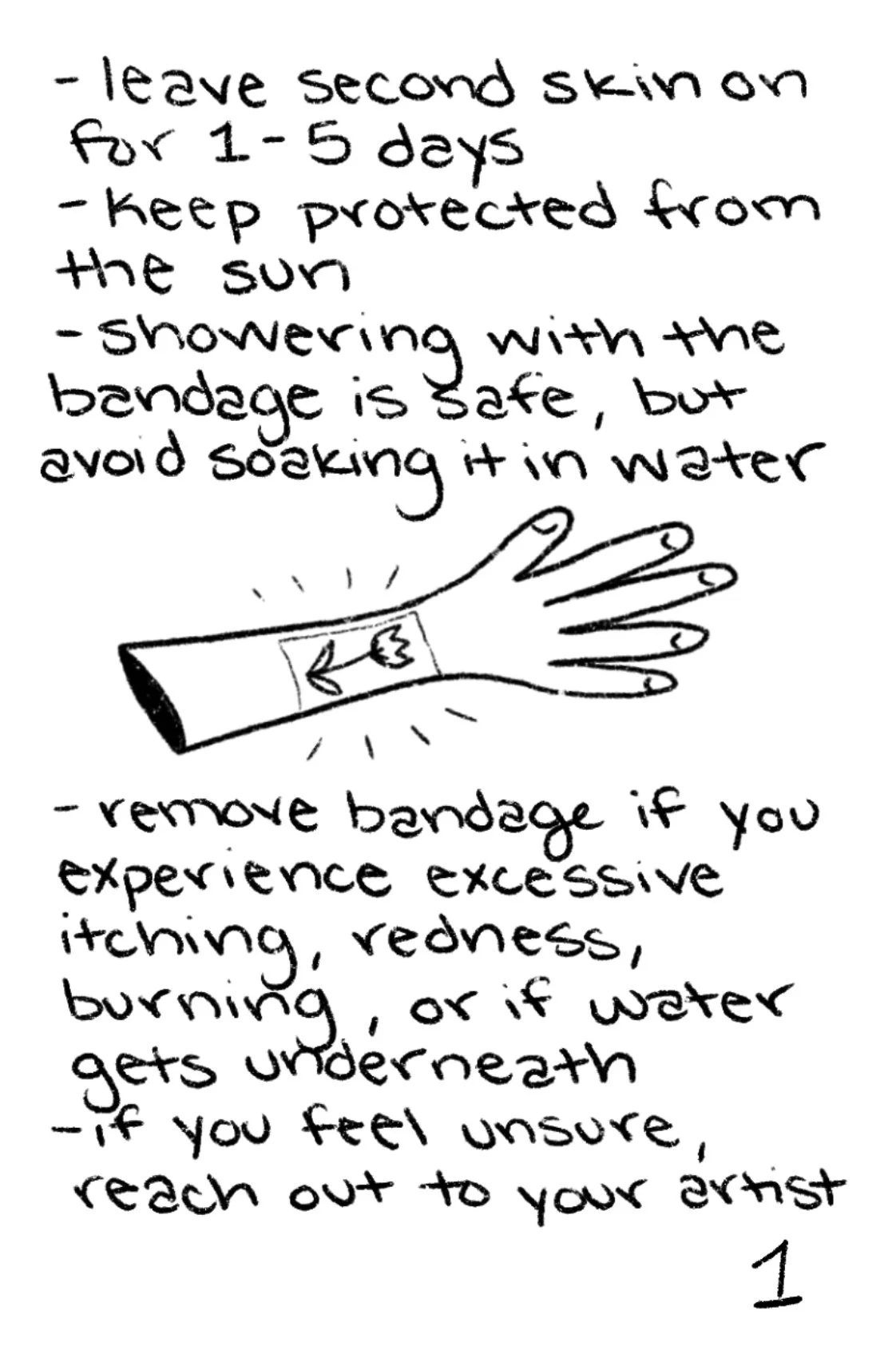 If you were bandaged with second skin (clear sticky bandage), leave your bandage of anywhere from 1-5 days. The bandage is waterproof, meaning you can shower with it on, but avoid swimming or submerging the tattoo in the bath. Allergic reactions to second skin can develop overtime! Remove the bandage immediately if you are experiencing excessive redness, itching, or burning.